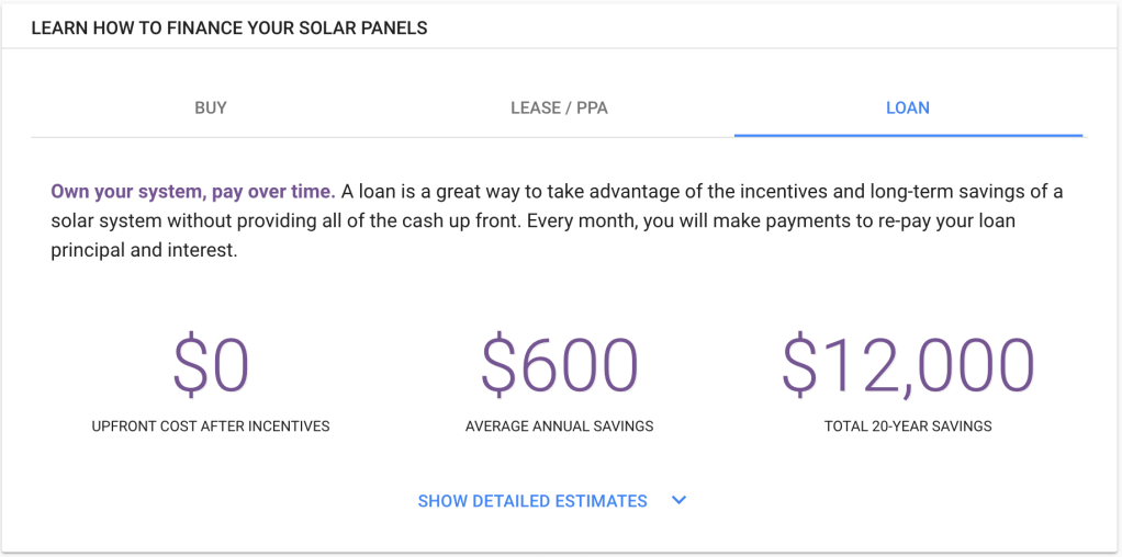 Project Sunroof also gives you an early indication of the savings and payoff period for your investment. They offer options for Buy, Lease or Loan. And here’s the kind of savings a random home in Northern California might expect: