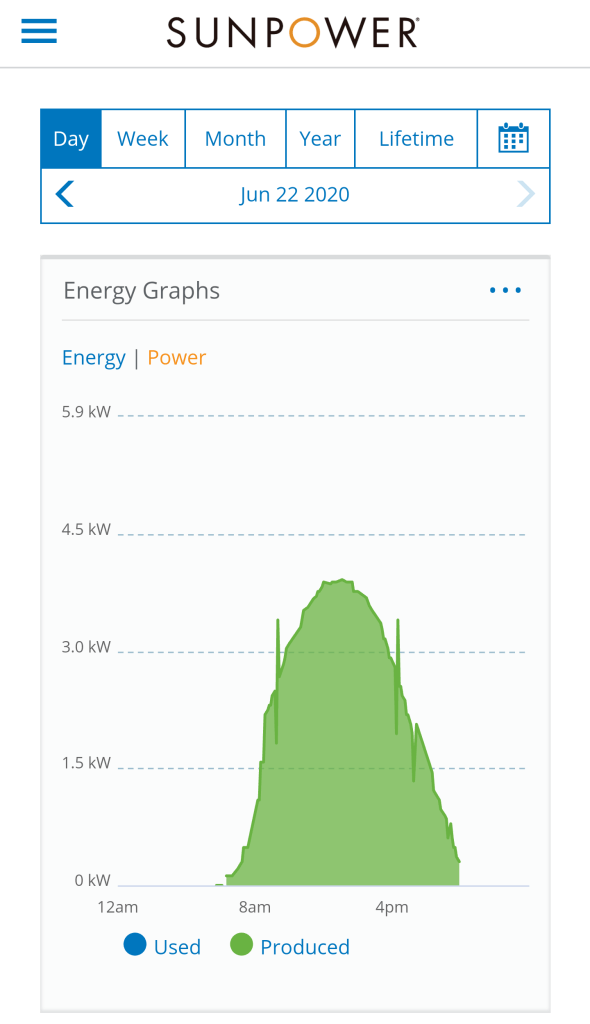 Sunpower has an app where you can see live and historical data for your home. (I believe other systems can do this – I’m just familiar with Sunpower.) I’ve essentially become an amateur tracker since I can directly see how clouds affect the power being generated by our system!